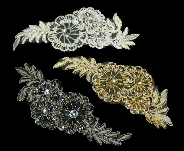 Vsadka je vyšítá na monofile, dozdobená sklíčkami, flitrami a sklenenými korálkami.