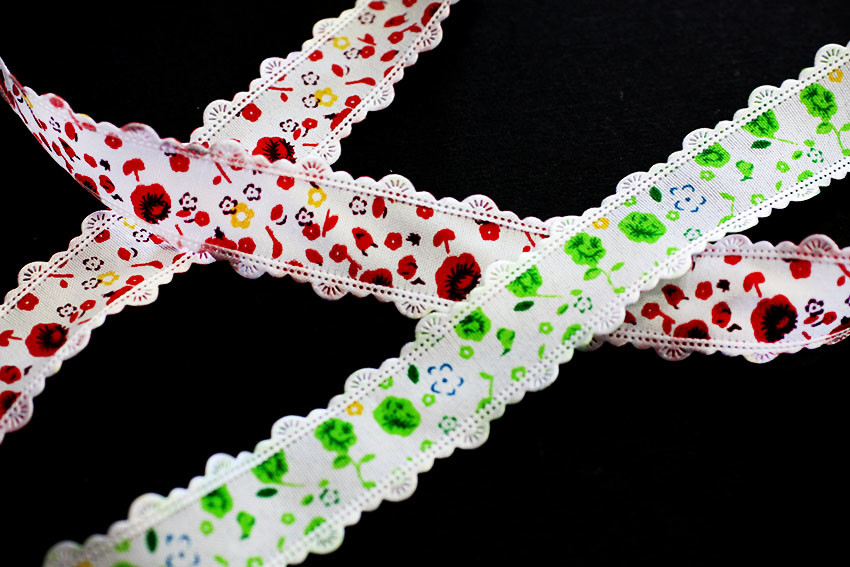 Táto potlačená stuha s kvetinovým vzorom, olemovaná vysekávanou saténovou krajkou je vhodná na dekoračné účely, ale aj na odevy, lebo sa môže ručne prať do 30st.C.